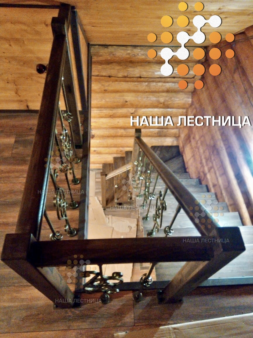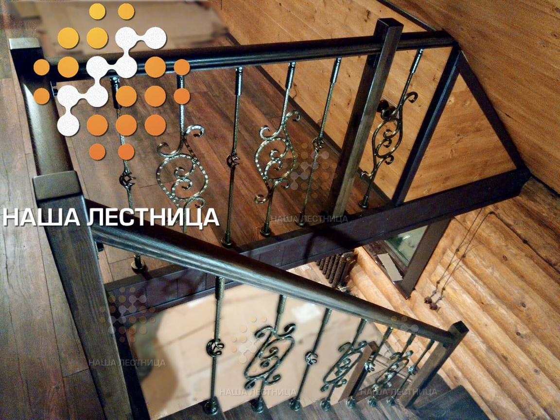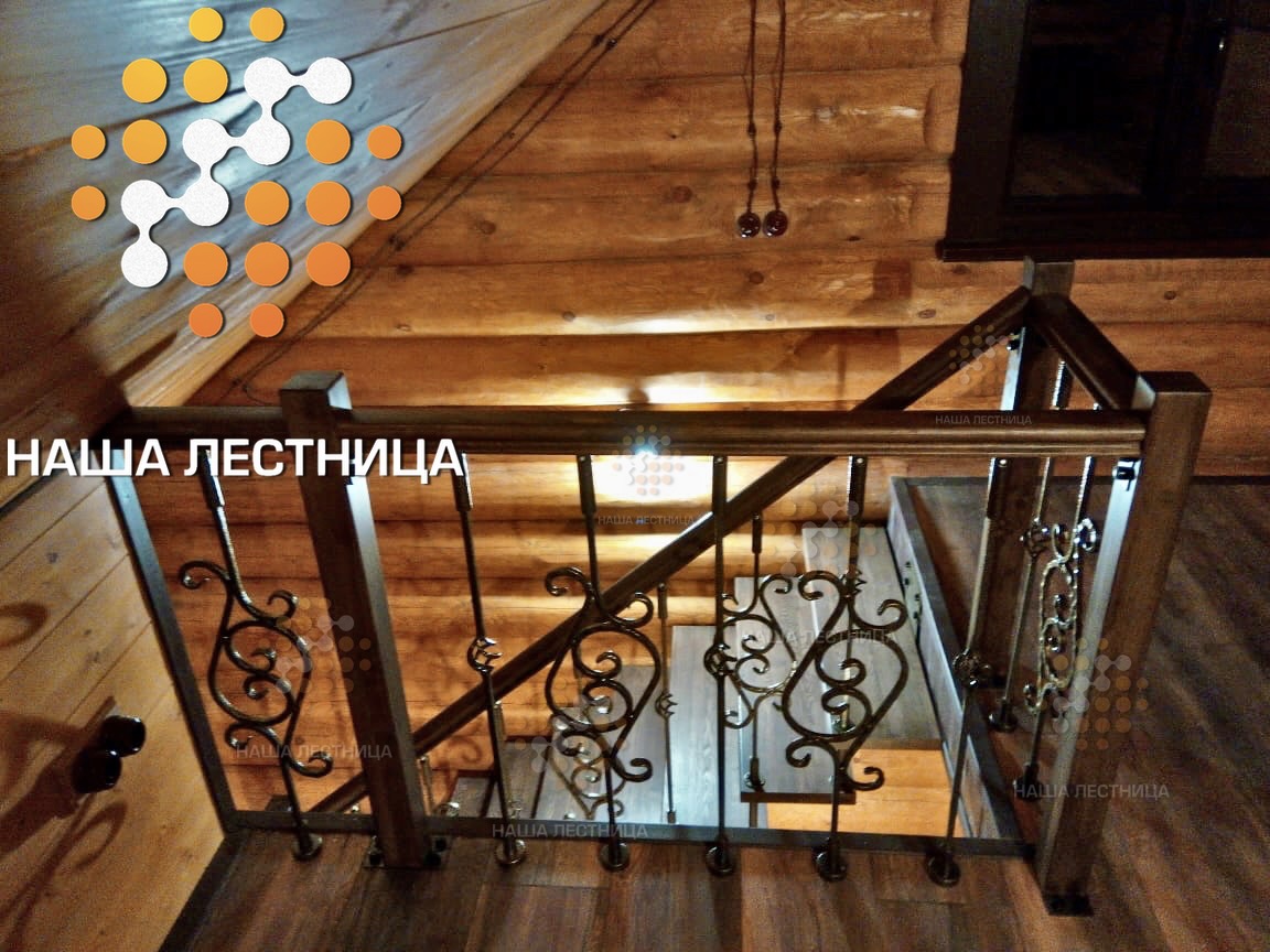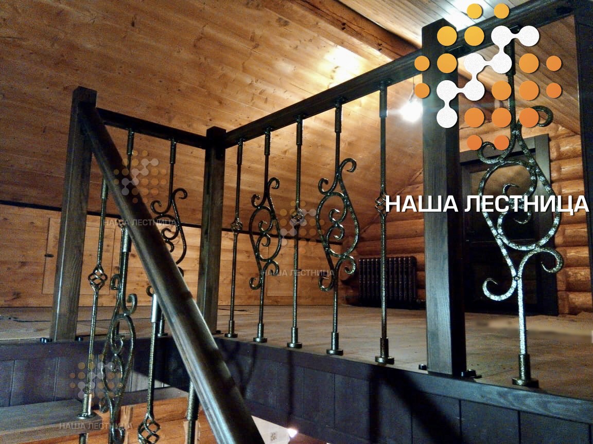 Недорогие ступени из сосны, тонированные на пару тонов темнее чем пол первого этажа. Балясины поручня мы сделали необычными - совместили недорогие и прочные «Композит» с кованными балясинами.
