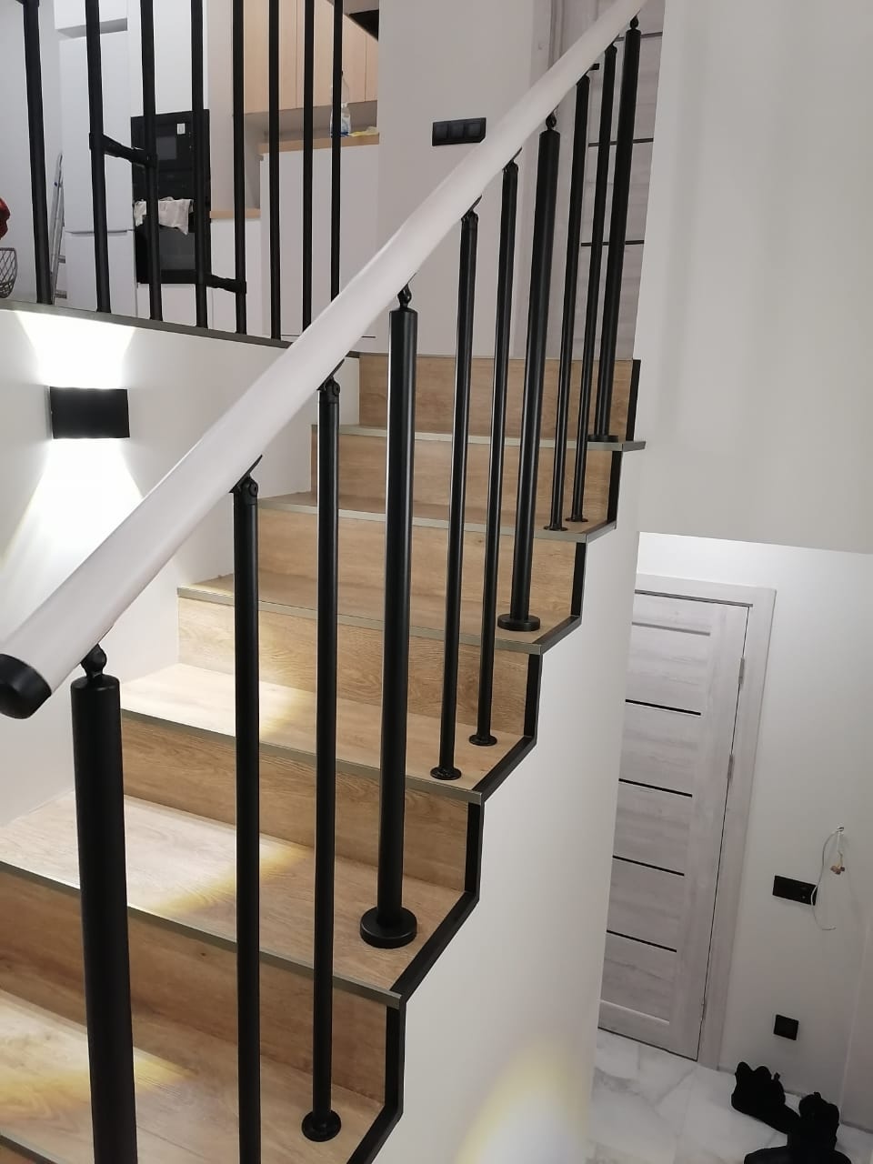 Центральный элемент (труба D25mm) полностью из обычной стали и краситься Итальянской, порошковой краской в цвет каркаса лестницы (можно в любой другой цвет), а сам ложемент (верхнее крепление к поручню) из прочного, композитного материала (откуда и название серии).